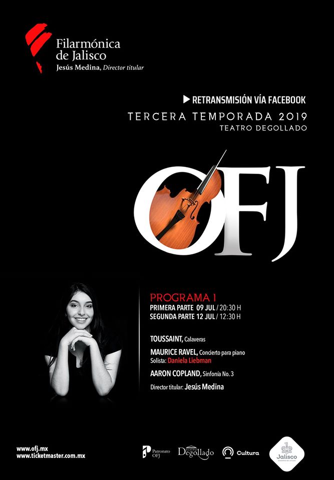 Retransmisión Programa 1, Tercera temporada 2019 con Toussaint, Calaveras / Maurice Ravel, Concierto para piano / Solista: Daniela Liebman / Aaron Copland, Sinfonía No.3 / Director titular: Jesús Medina.