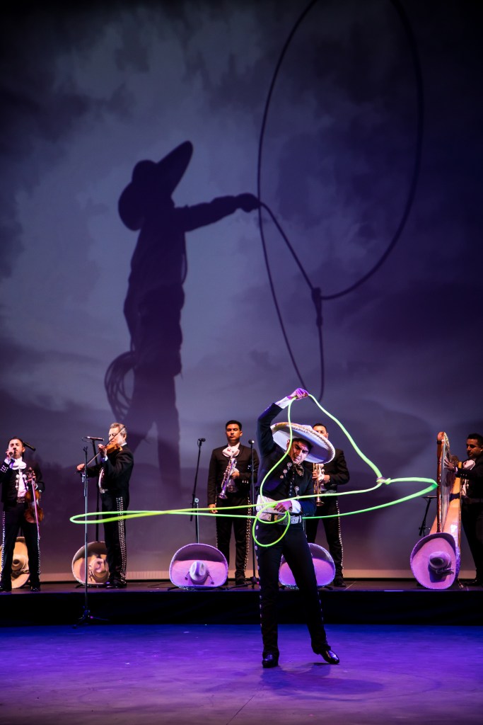 Iniciando con la danza llamada La Leyenda de la Danza Mayahuel, remontándonos a épocas prehispánicas, seguido de la pieza “Fiesta en Jalisco”. Canciones clásicas de mariachi como “El Jarabe Tapatío” y “El Toro Viejo”, durante la cual, un charro realizó todo tipo de suertes con una soga.