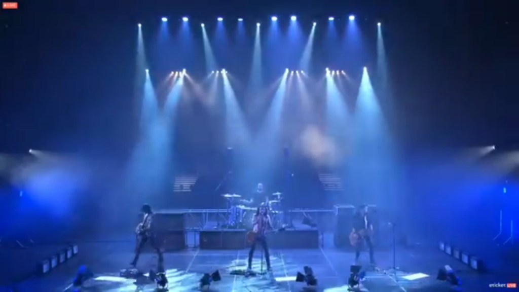 El show inició puntual, con la cámara acompañando a la agrupación en el camino de los camerinos hacia el majestuoso escenario del Telmex, que encendió sus luces dejando ver los asientos vacíos del auditorio.
