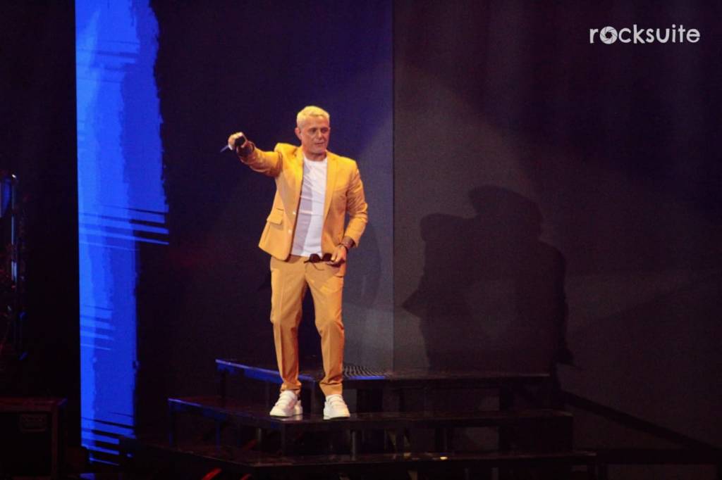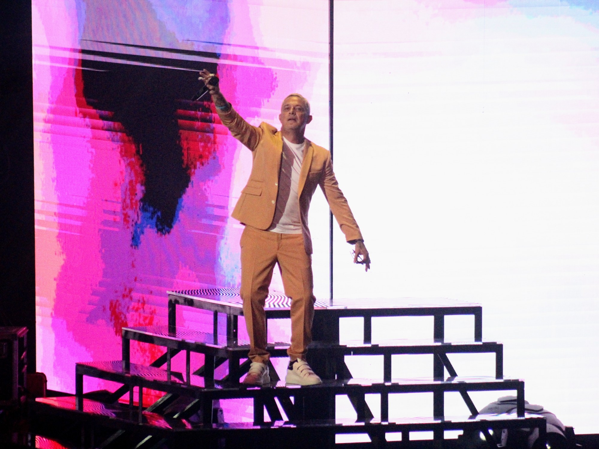 Portando un traje color mostaza que combinaba con su cabello rubio, el cantautor llegó con su tour «Sanz en vivo» ante aproximadamente 9,000 tapatíos.