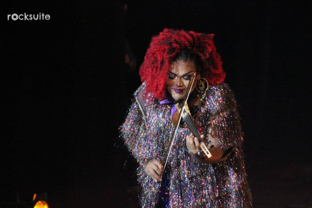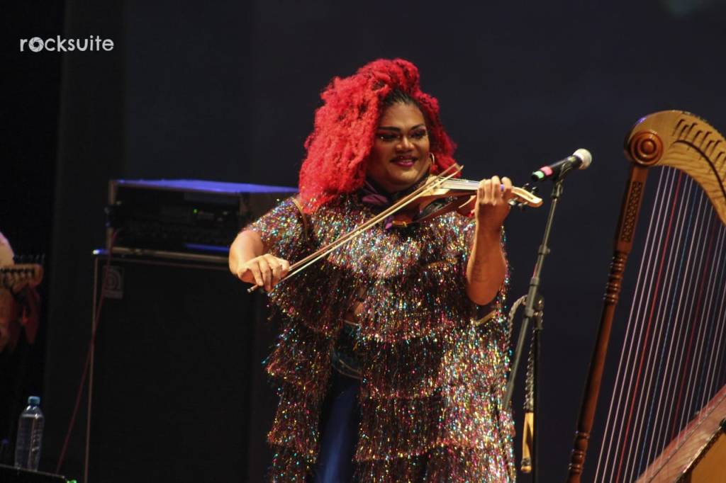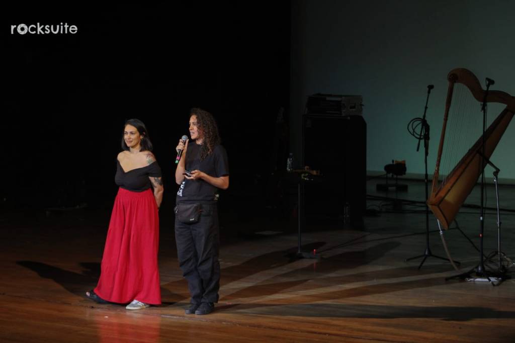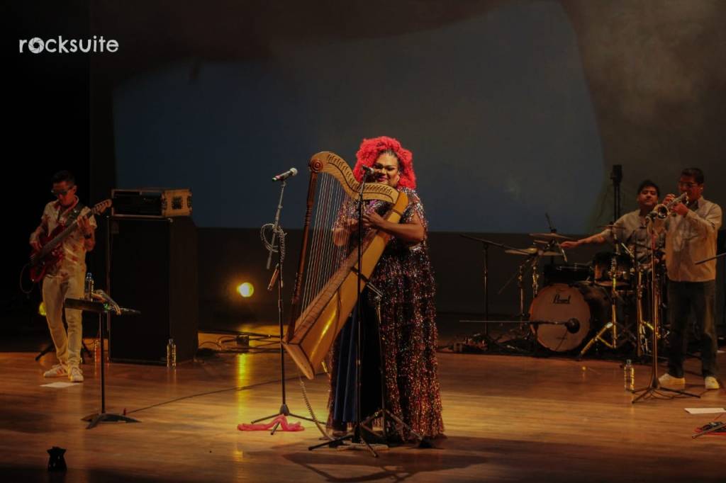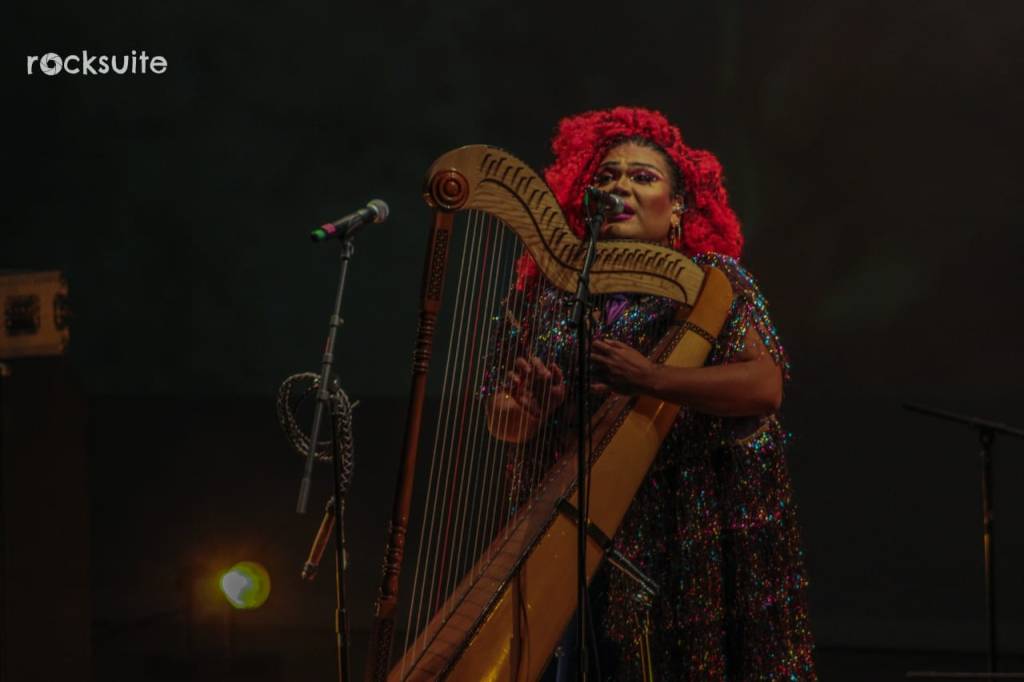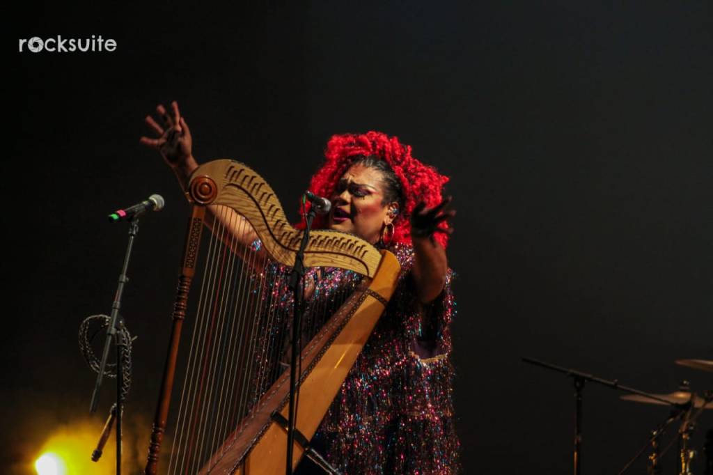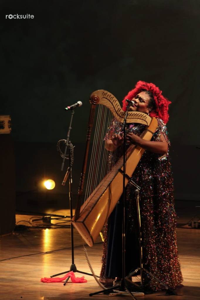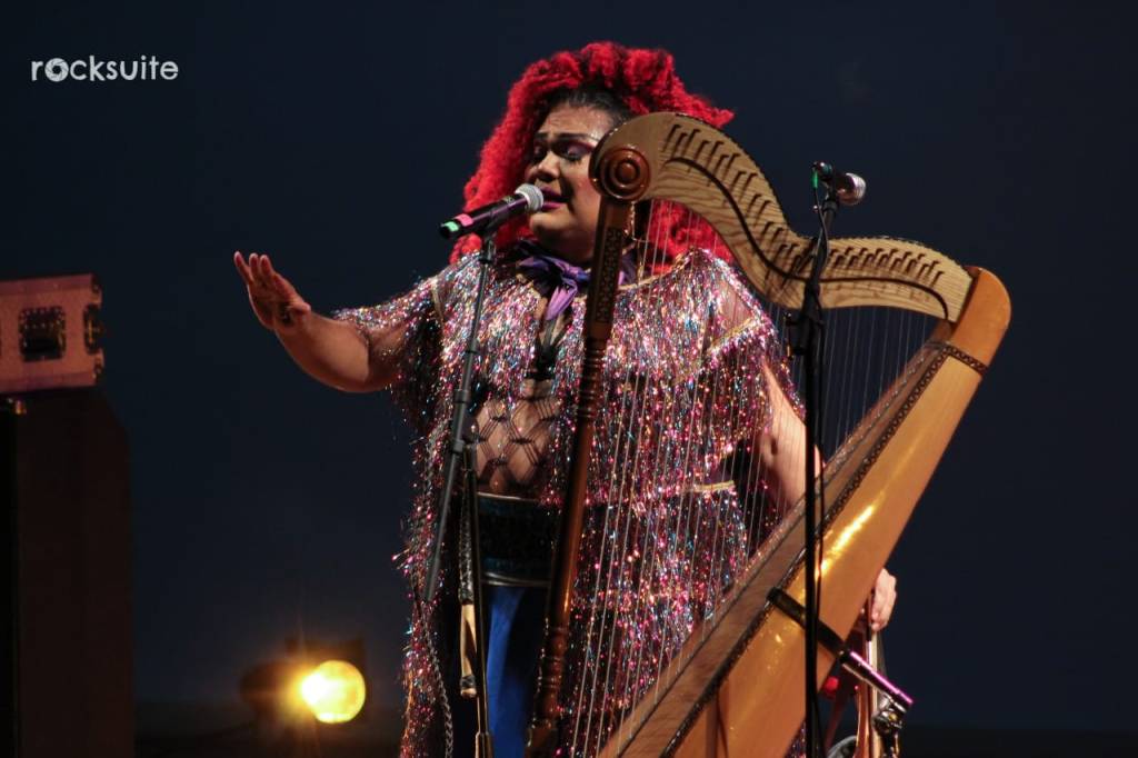 De pronto se oscureció el teatro y de entre el público, surgió una bruja con cabellos rojos carmín, vestida en una brillante Huipil tornasol, presentándose a su manera y con copal en la cabeza comenzó a hechizar al público con su ritmo único. La Bruja de Texcoco nos contó conforme avanzaba la noche, las historias de las canciones de cómo se enamoraba y se desilusionaba, de cómo pensó que había encontrado el amor a través de una app de ligue, todas las anécdotas de la bruja que se han convertido en música, fueron acompañadas del arpa, el violín, la batería, guitarras y trompeta con ritmo mexicano, en donde ella viene a quitar el patriarcado en la música tradicional mexicana.