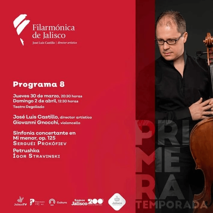 El último programa de esta 1ra temporada 2023 en el Teatro Degollado, bajo la dirección titular de José Luis Castillo, nos trae el distinguido violonchelista italiano Giovanni Gnocchi desde Salzburgo, Austria. El programa comienza con la Sinfonía concertante de Sergey Prokofiev, obra a gran escala para violonchelo y orquesta que destaca el talento de Giovanni Gnocchi. Para cerrar la temporada con broche de oro, la OFJ interpreta un ballet compuesto en 1911, Petrushka de Igor Stravinsky. Petrushka, un payaso subversivo, es representado durante la obra por un disonante «acorde Petrushka» que empieza en los clarinetes. Al final de la obra, el acorde representa su fantasma, que escuchamos en las trompetas con sordina. Su autor escribió en una carta: «Mi Petrushka se renueva completamente cada día, con nuevos rasgos desagradables en su carácter, pero me deleita porque está absolutamente desprovisto de hipocresía.