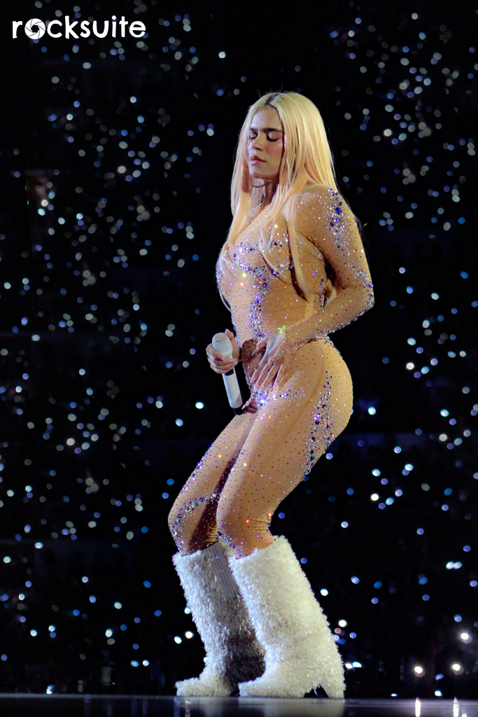 El concierto arrancó con la explosiva «TQG», donde Karol G hizo su entrada saliendo debajo del escenario. El estadio vibró con la energía de los fans que gritaban y coreaban sin descanso. A continuación, la artista y sus talentosas bailarinas llevaron el espectáculo a otro nivel con su tema «BESTIES», encendiendo aún más el Estadio 3 de Marzo.