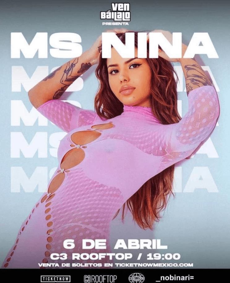 Si hay alguien que sabe cómo encender la pista de baile, esa es Ms. Nina. Con su estilo único y su música que fusiona ritmos urbanos con influencias electrónicas, ha conquistado los corazones de miles alrededor del mundo. Desde sus éxitos más conocidos como «Chupa Chupa» «Tu sicaria» hasta sus colaboraciones más recientes que no dejan a nadie indiferente, Ms. Nina promete una noche llena de beats contagiosos y letras pegajosas que te harán bailar sin parar.