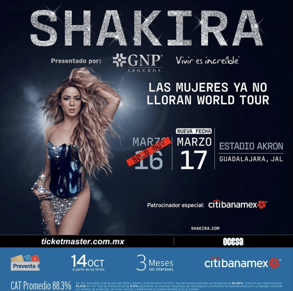 Después de presentarse en Monterrey y Guadalajara, Shakira llegará al renovado Estadio GNP Seguros en la capital del país -con capacidad para 65,000 personas-, convirtiéndose en la primera artista en la historia de México en vender 7 shows consecutivos en este recinto.